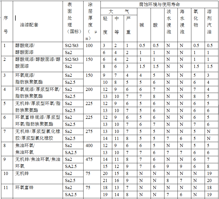 NACE油漆配套使用年限表(表1)